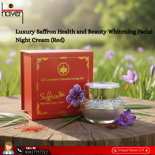 Luxury Saffron Health and Beauty Whitening Facial Night Cream একটি প্রিমিয়াম নাইট ক্রিম যা ত্বকের দাগ, মেছতা ও বয়সের ছাপ দূর করে ত্বককে উজ্জ্বল, নরম ও মসৃণ করে তোলে। প্রথম ব্যবহার থেকেই আপনি ত্বকের স্পষ্ট পরিবর্তন অনুভব করবেন — ত্বক হবে ৬–৭ শেড বেশি উজ্জ্বল এবং কোনো পার্শ্বপ্রতিক্রিয়া ছাড়াই।